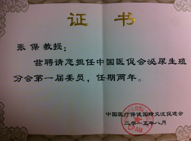 2015年9月,在国家会议中心举办的亚太性医学年会上,航天中心医院泌尿外科的张保主任因其在泌尿外科、男科疾病领域的成就和影响力,被聘为中国医促会泌尿生殖分会委员并被授予证书。