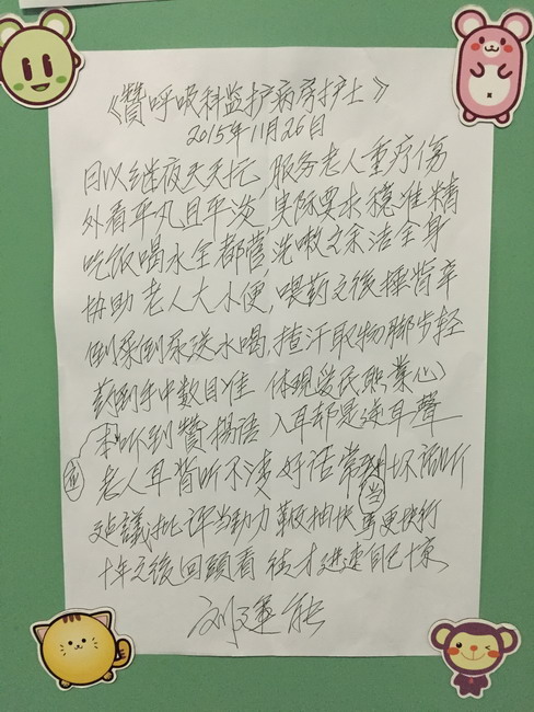 只有我们自己知道,作为重症监护室的护士,每天经历着与死神抗争的过程,每天要有大量琐碎的工作要我们逐一无误的去完成,有时下班都会觉得身心俱疲。就在这样一个既紧张又繁忙的工作环境中,收到这样一份“礼物”,使我们每个人都有了动力,让我们觉得我们的工作获得了患者诚挚的理解和赞许,我们的用心付出得到了患者的肯定,感动之余,我们的内心同样也觉得无比自豪!