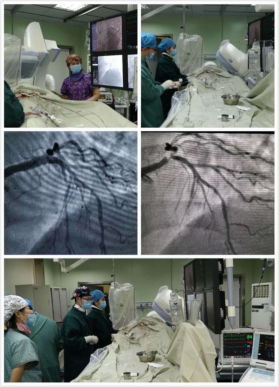 曲副主任与家属充分交代病情,家属拒绝行外科治疗,恳请主任行支架植入术。曲副主任、高炬医生、翟东东医生、赵运涛博士后商讨好,制定了手术方式。手术由曲副主任主做。王红护士长、于颖护士准备好IABP(主动脉球囊反搏泵)及用物,协助医生们先行IABP植入,保驾护航。准备好除颤仪、贴好除颤电极片,防止导丝通过病变时因缺血而室颤,可以立即除颤;准备好急救用药。手术室内气氛一下紧张起来,台下护士于颖将所有术中用品准备到手边,动作麻利;台上医生们高度集中精力,小心翼翼送导丝,王红负责紧盯监护仪,站在随时可以给药、除颤的位置。手术紧张的进行着,台上医生谁负责送导丝、谁负责打造影剂、谁负责打球囊,配合的天衣无缝。此处病变要求每一步都准确、快速。2分钟之内球囊扩张、支架植入扩张完成。病人危险解除。充分扩张支架,穿支架网眼扩张回旋支开口,造影显示血流通畅无阻。行IVUS(血管内超声检查)检查,支架贴壁良好,手术结束。