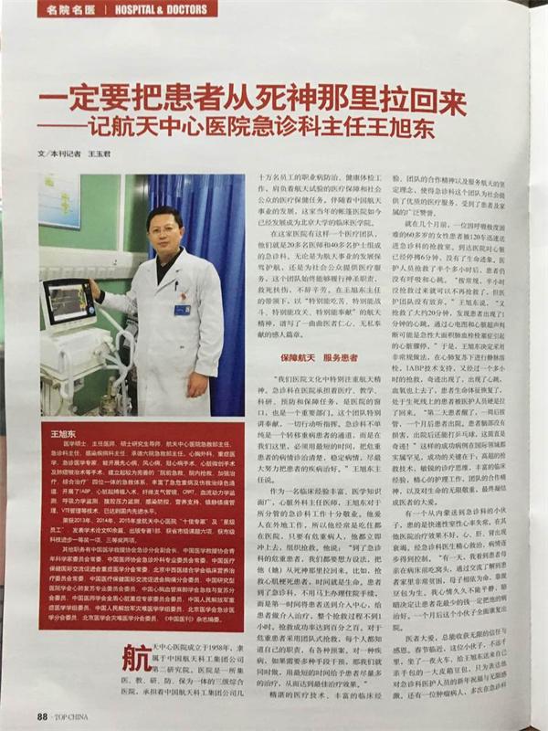 2017年1月,急诊科医护团队救死扶伤的感人故事登上了《中华英才》杂志,详尽介绍了急诊科始终秉承“特别能吃苦、特别能奉献、特别能战斗、特别能攻关”的航天精神,在医疗战线上创造出不凡的业绩。
