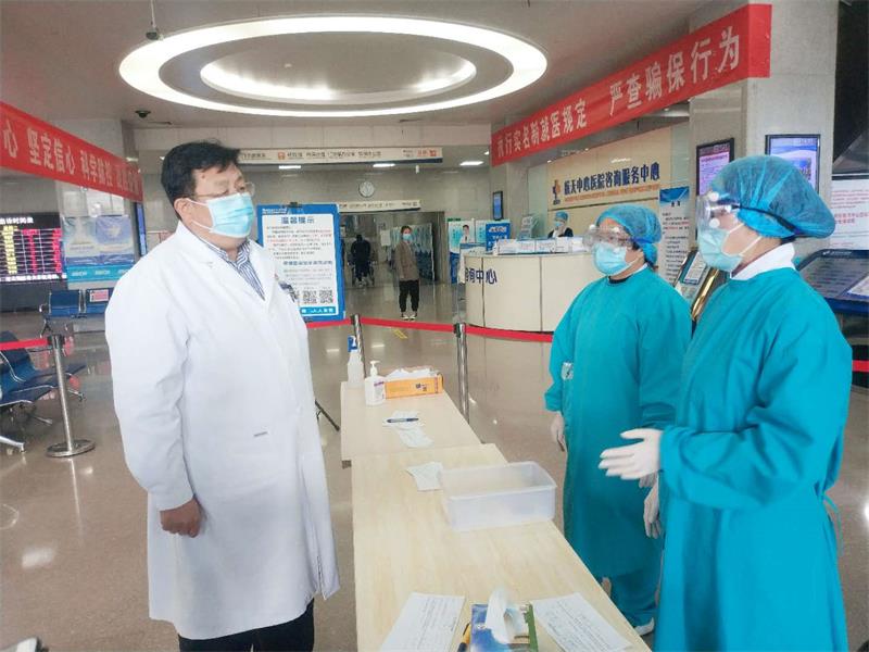 4月1日,医院管理职能部门人员接过健康管理部医护人员的接力棒,开始了医院各入口的预检分诊工作。医院党委书记张向群和副院长李继来第一时间到医院各入口看望大家,并强调这项任务的重要性。