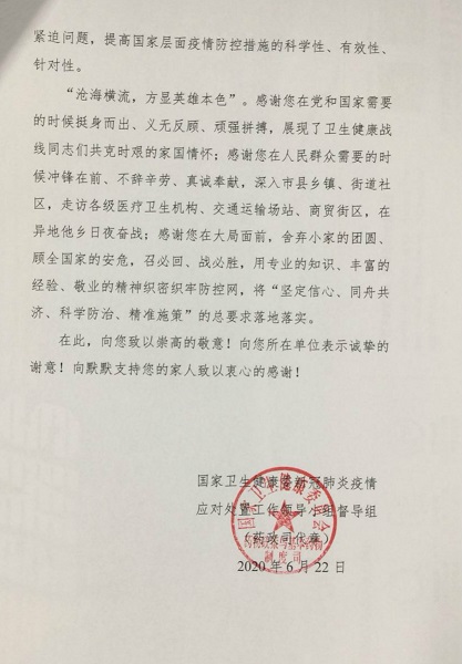 国家卫生健康委在感谢信中写到:在地方工作期间,她积极响应党中央关于新型冠状病毒肺炎疫情防控工作的号召,切实将中央应对新冠肺炎疫情工作领导小组各项决策部署落到实处,践行“一切为了人民健康”的初心使命,认真学习习近平总书记重要讲话和中央政治局常委会会议精神,督促指导地方将中央应对新冠肺炎疫情工作领导小组,国务院应对新冠肺炎疫情联防联控机制各项决策部署落到实处,全面参与疫情防控工作,协助地方分析研判疫情形势,制定防控方案,研究解决防控工作中的突出问题,指导并协助地方落实党中央国务院有关疫情防控工作的要求,及时发现问题,提出意见建议。积极反馈地方疫情防控工作情况,协调推动解决防控工作中遇到的紧迫问题,提高国家层面疫情防控措施的科学性、有效性、针对性。作为督导组专家成员,陈小琤和专家们一起,督导地方医院在联防联控机制运行情况、值班值守情况、疫情监测情况、医疗救治情况、街道(乡镇)社区(村)防控情况、防控物资储备情况等工作。无畏无惧的她深入基层踏实工作,从不计较个人得失,圆满完成了各项工作任务。
